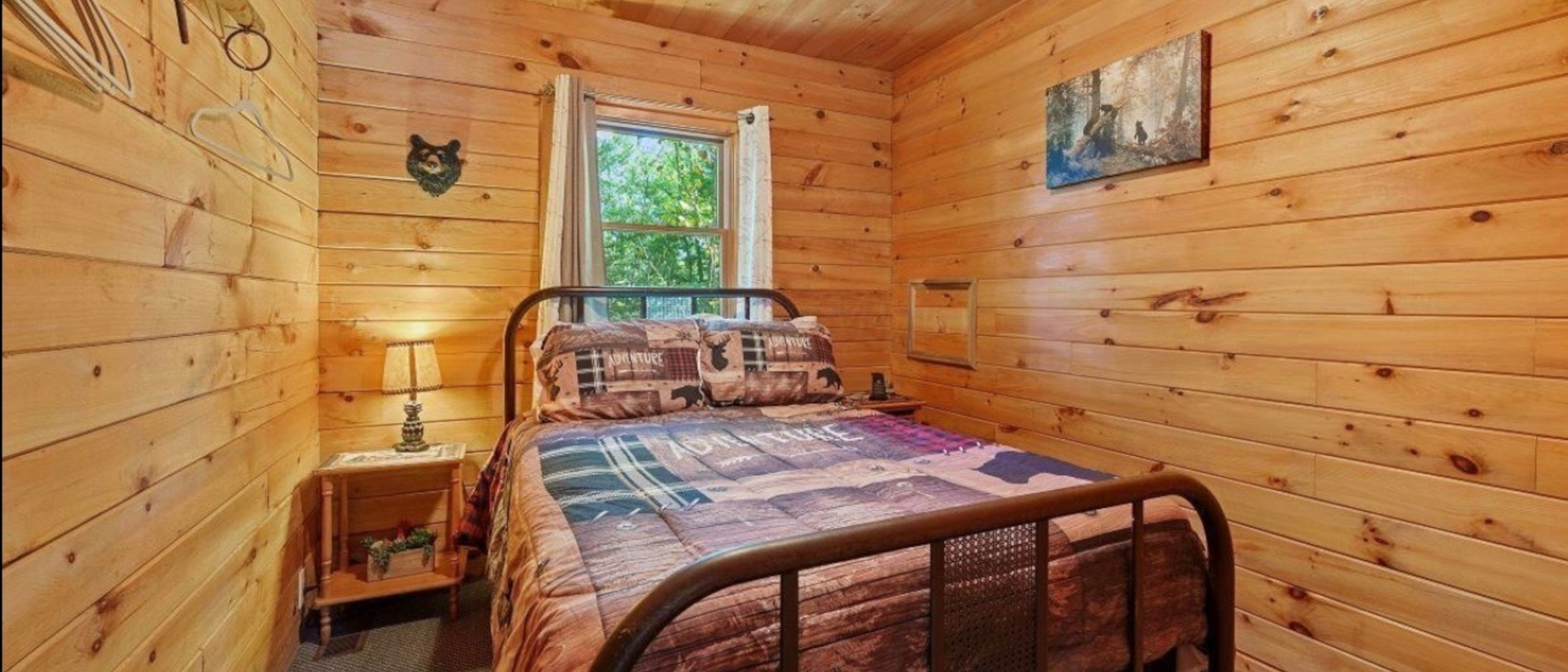 1 Bedroom Cabin featuring a covered screened-in porch with hot tub, porch swing and picnic table.Fully equipped kitchen, full bath with tub and shower. Living room with sofa, recliner and futon including a fire with gas logs. Charcoal grill. King-size Bed